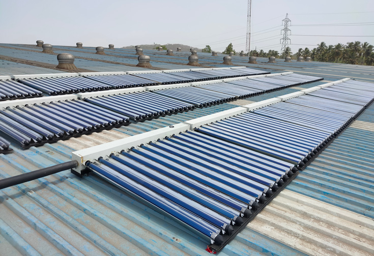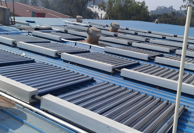 - The heating is being done using Compound Parabolic Concentrator Solar Water Heating System to provide 5000 litres of hot water at 80°c.